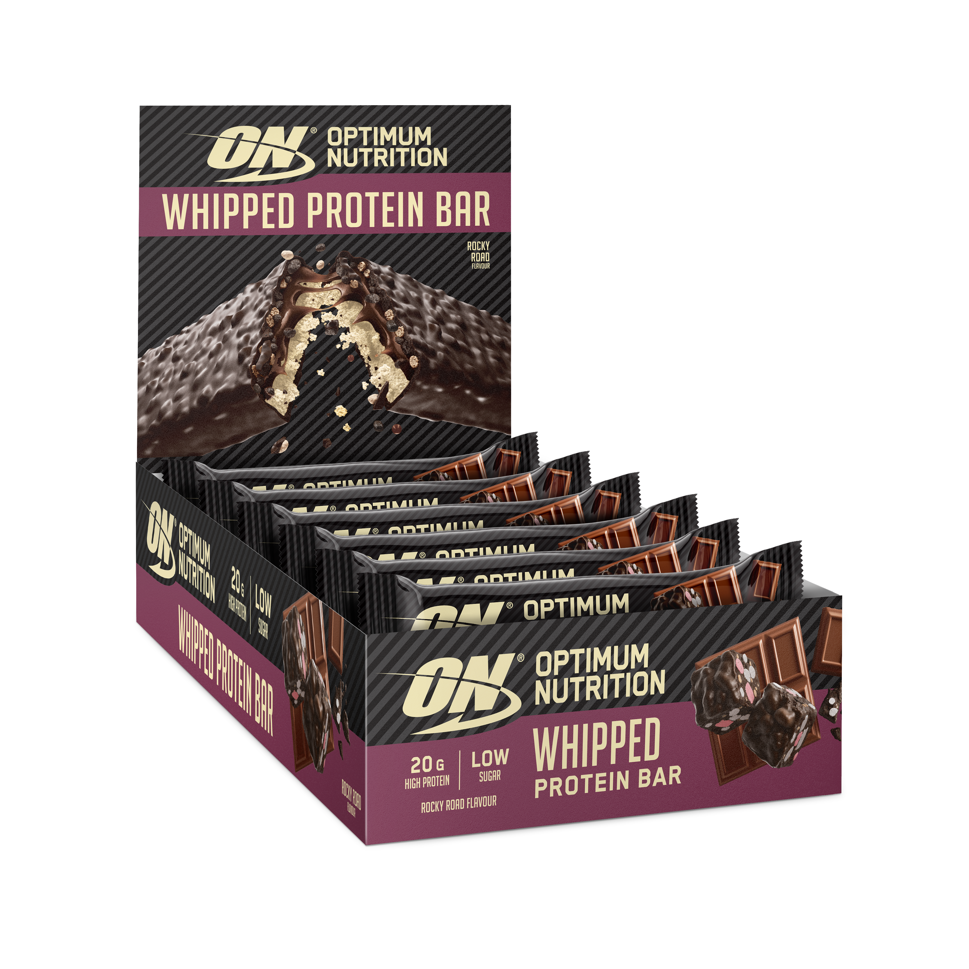 WHIPPED PROTEIN BAR - The optimum balance of High Protein and great taste The Optimum Nutrition Whipped bar is the perfect balance of high protein and great taste! A delicious, soft and whipped base is topped with layers of crispies and caramel, and enrobed in real milk chocolate coating for an unrivalled taste experience. Protein bars aren't supposed to taste this good. New delicious, milk chocolate coating. 20g of protein per bar. High fibre and low in sugar. Free from palm oil and suitable for vegetarians Delicious high-protein, whipped Belgian chocolate bar from Optimum Nutrition to help you grow and maintain muscle