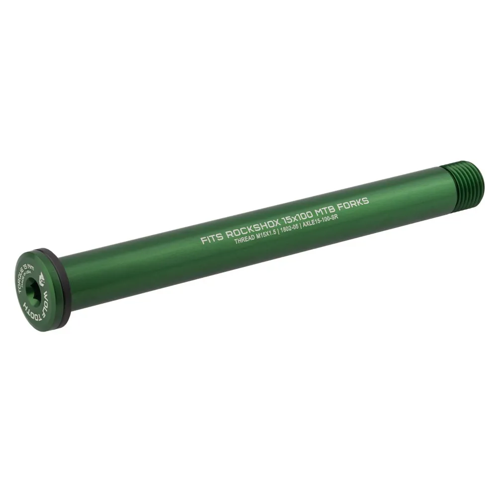 TheWolf Tooth Axle for RockShox and Fat Forksis perfect if you're looking fora front axle that is easy to use, lightweight and looks great.Easily installed with a 6mm hex key.Unlike other similar products,Wolf Tooth Axle for RockShox and Fat Forksuses a captive steel washer under the head to reduce friction on the fork leg. This protects your expensive fork, transfers more of the tightening torque to clamping load for a stiffer interface and prevents the axle from sticking or galling when you want to remove it. These are also a great replacement option for lost or damaged stock axles. Always apply a small amount of grease to the washer and threads when installing. Wolf Tooth Axle for RockShox and Fat ForksCompatibility RockShox 100 (standard) and 110 (Boost) suspension forks NOT compatible with RS-1 fork RockShox Bluto 150 mm hub Most rigid fat forks with 150 mm hub Wolf Tooth Axle for RockShox and Fat Forks Specifications Material: 7075 T6 aluminum with plated steel washer Thread spec: 15x1.5 Thread length: 12mm Weight: 100 mm / Standard - 45g, 110 mm / Boost - 47g, 150 mm / Fat - 58g Made in the USA